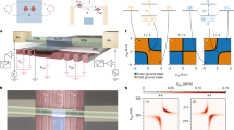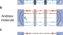 In superconductor-semiconductor hybrid structures, electrons arriving from a semiconductor with energies below the superconducting gap are prohibited from entering the superconductor and are reflected back into the semiconductor as quasiholes via Andreev reflection27. Through this mechanism, an electron-hole standing wave, known as an Andreev bound state, can form in the semiconductor. In a single quantum dot, Andreev bound state spectrum consists of a spin-singlet state (S) which is a superposition of 0 and 2 electrons on the quantum dot, and two doublet states D ↑ and D ↓, both of which correspond to a single electron on a quantum dot either in the spin up or spin down state. In Fig. 1b, we depict the Andreev spectra of two decoupled quantum dots along the energy level detuning axis, meaning that the electrostatic energies on the two dots are changed in the opposite directions. From negative to positive detuning, the left dot is occupied with 2, 1, and 0 electrons, while the right dot is occupied with 0, 1, and 2. In the (2,0) and (0,2) double dot configurations, singlet states on both dots are lower in energy than doublets. In the (1,1) configuration, doublets are the ground states. We note that in the experimental system the charge occupations of the dot are unknown but the discussion is provided in terms of 0, 1, 2 electrons on each dot for clarity and because in superconducting systems properties most strongly depend on parity (even or odd) of the charge occupations.