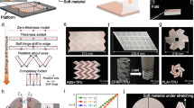 Origami has been a popular method for designing building blocks to construct mechanical metamaterials9,10,11,12,13,14,15,16,17. In particular, a quadrangular mesh origami, e.g., Miura-ori pattern18, has been studied extensively, because it offers a single degree of freedom (DOF) mechanism of folding without relying on the elasticity of materials. This structure is called rigid (foldable) origami, and its 1-DOF motion can be beneficial for the control of deployable planar structures, such as solar panels and sails19, 20 and sandwich core materials21.
