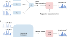 A many-body quantum state of n qubits can be written as \(\left| \Psi \right\rangle = \mathop {\sum}\nolimits_{\bf{v}} {\Psi \left( {\bf{v}} \right)\left| {\bf{v}} \right\rangle } \) in the computational basis with v ≡ (v 1, …, v n ), where the wave function Ψ(v) is a general complex function of n binary variables v i ∈ {0, 1}. In the neural network representation by a Boltzmann machine, the wave function Ψ(v) is expressed as \(\Psi ({\bf{v}}) = \mathop {\sum}\nolimits_{\bf{h}} {{{\rm{e}}^{W({\bf{v}},{\bf{h}})}}} \), where the weight W(v, h) is a complex quadratic function of binary variables v and h ≡ (h 1, …, h m ) called visible and hidden neurons, respectively. The number of hidden neurons m is at most poly(n) for an efficient representation. In the graphic representation shown in Fig. 1, the neurons v i and h j connected by an edge are correlated with a nonzero W ij in the weight \(W({\bf{v}},{\bf{h}}) = \mathop {\sum}\nolimits_{i,j} {{W_{ij}}{v_i}{h_j}} \). For the RBM (Fig. 1a), the layer of visible neurons is connected to one layer of hidden neurons (neurons in the same layer are not mutually connected). The DBM is similar to the RBM but with two or more layers of hidden neurons (Fig. 1b). Two hidden layers are actually general enough as one can see in Fig. 1b that odd and even layers can each be combined into a single layer. A fully connected Boltzmann machine is shown in Fig. 1c. In the methods section, we prove that any fully connected Boltzmann machine can be efficiently represented by a DBM as illustrated in Fig. 1d.