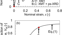 Figure 6a shows the variation of the lattice parameters and unit cell volume for the equivalent cubic, PM (a pm ≈ (1/√2) a c, b pm ≈ a c, c pm ≈ (1/√2) a c) and martensite (a m ≈ (1/√2) a c, b m ≈ a c, c m ≈ (1/√2) a c) with temperature. It is evident from Fig. 6a that unit cell volume for all the phases decreases with decreasing temperature. However, the volume of the cubic austenite phase changes rather smoothly across the austenite to PM (T1) phase transition (260–245 K), similar to that in Ni2MnGa, as expected for a weak first-order phase transition. However, on lowering the temperature further, a discontinuous change in the volume is observed at T ~ 235 K with a concomitant splitting of the cubic austenite peaks (Figs. 6a and 2e) and change of slope in the ac-χ vs. T plot (Fig. 1). This discontinuous change in volume occurs at the cubic premartensite to the Bain-distorted PM phase transition and confirms the first-order nature of this phase transition. Furthermore, a clear discountinuous volume change during Bain-distorted PM (T2) to martensite phase transition is also observed confirming the first-order character of this transition as well. The b/a ratio shown in the inset of Fig. 6a also exhibits discountinuous change at temperatures corresponding to the different phases. We believe that the formation of the PM (T1) phase in the cubic austenite matrix, followed by robust Bain-distorted PM (T2) phase in the PM (T1) matrix and finally the fully Bain-distorted martensite phase in the PM (T2) phase is kinetically more favorable for maintaining an invariant habit plane all through the transition due to the gradual evolution of the Bain distortion.
