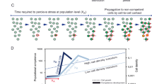 Why is competence controlled by CSP? CSP does not act as a timing device in our encapsulated strain since competence develops in a cell-density-dependent manner without the necessity of cell–cell contact16, 17, 20 (Figs. 2 and 3). Regarding the hypothesis that CSP is a probe to test diffusion21, our results suggest that focusing on diffusion alone oversimplifies the information and functionality that cells can gather through CSP production. We hypothesize that by using an autoinducer peptide, bacteria can coordinate the development of competence and in particular the expression of fratricins and bacteriocins, which are under the control of the competent state. These proteins can lyse or inhibit the growth of surrounding cells that are not competent, increasing the efficiency of genetic transformation and mediating competition with other bacteria37,38,39,40. By coordinating competence expression via CSP, an isogenic bacterial population can increase the total concentration of secreted fratricins and bacteriocins in times where population density is high, which likely translates into a higher amount of lysed cells and therefore potential DNA donors. Importantly, coordinating competence expression can also prevent the killing of clonal siblings since immunity to these proteins comes with the competent state. Note however that the extent to which cells synchronize competence development may vary depending on the strain, genotype and growth conditions. In particular, our results suggest that unencapsulated strains may synchronize less, which would explain the difference between the findings reported by Prudhomme et al.20 and our study. Decreased synchronization may result from cells exporting less CSP to the extracellular space and keeping more to themselves. In fact, in other species like Streptococcus thermophilus where competence is controlled by ComS, a peptide that rapidly gets imported back into the cell, the rate of competence development decreases with the inoculation density41 as observed for the unencapsulated pneumococcal strains. Finally, note that S. pneumoniae grows primarily in biofilms where there is heterogeneity in the physiological status and microenvironment that different cells experience. This can certainly influence the degree of synchronization in competence initiation across a population especially in the light of our findings that both current and past environmental conditions affect the competence regulatory network. Indeed, recent work in Streptococcus mutans showed heterogeneous competence activation of cells within biofilms and upon different environmental pH ranges42, 43. While studies of well-mixed cultures give insight into the response mechanism shared by all cells in a population, additional work is needed in the future to study how CSP production and detection by individual cells is shaped by their spatial context and history and to unravel how individual responses translate into patterns of population synchronization across different genotypes and strains.