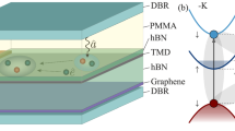 In monolayer TMDs, the spin and the valley pseudospin are effectively coupled by spin–orbital coupling and broken inversion symmetry1. Bilayer TMDs possess another degree of freedom, viz., layer pseudospin16. In a bilayer, the Hamiltonian at ±K-points can be expressed in a two-band approximation as \({H_{\rm{c}}} = \Delta + {\lambda _{\rm{c}}}{\tau _{\rm{z}}}{s_{\rm{z}}}\sigma _{\rm{z}}^{\rm{c}}\) for the conduction band and \({H_{\rm{v}}} = - {\lambda _{\rm{v}}}{\tau _{\rm{z}}}{s_{\rm{z}}}\sigma _{\rm{z}}^{\rm{v}} + {t_ \bot }\sigma _{\rm{x}}^{\rm{v}}\) for the valence band, where Δ is the bandgap, λ c (λ v) denotes the spin–orbit coupling of conduction (valence) band and t ⊥ is the interlayer coupling of the layers. The strong coupling between the valley (τ z) and layer \(\left( {\sigma _{\rm{z}}^{{\rm{c}},{\rm{v}}}} \right)\) pseudospin, and the real spin (s z) is a distinguishing feature of bilayers. The layer Pauli operators \(\sigma _{\rm{z}}^{\rm{c}}\) (\(\sigma _{\rm{z}}^{\rm{v}}\)) are expressed in the basis of \({d_{{{{z}}^2}}}\) \(\left( {{d_{{x^2} - {y^2}}} \pm i{d_{xy}}} \right)\). The interlayer hopping, t ⊥, vanishes for conduction band due to the symmetry of \({d_{{{{z}}^2}}}\) orbitals. When the spin–orbit coupling strength λ v is much larger than the interlayer hopping amplitude, holes are primarily confined to either upper or lower layer, which can be labeled with layer pseudospin up \(\left| u \right\rangle \) or down \(\left| l \right\rangle \).