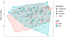 The evolution of differences in larval period and developmental plasticity among spadefoot toad species provides a clear example of an evolutionary pattern consistent with genetic accommodation (Fig. 1)16, 17, 23. In particular, P. cultripes exhibits significant plasticity in the timing of metamorphosis, as its larval period was shortened by ~40% when exposed to low water conditions (31.4 ± 0.56 [mean ± standard error] days in high water vs. 18.4 ± 0.54 days in low water) (Fig. 1b)13, 16, 17. By contrast, tadpoles of S. couchii, which breed in ephemeral ponds, had a much shorter larval period (6.6 ± 0.16 days in high water) and did not accelerate development when exposed to simulated pond drying (Fig. 1b). The larval period of S. multiplicata was intermediate to S. couchii and P. cultripes and also showed an intermediate plastic response to simulated pond drying (the larval period shortened by ~20%; 9.1 ± 0.28 days in high water vs. 7.2 ± 0.36 days in low water) (Fig. 1b)13, 16, 17. The short larval period with reduced plasticity of S. couchii represents a derived and canalized developmental state16, 22. The divergence of reaction norms among spadefoot toad species is consistent with evolution by genetic accommodation of the timing of metamorphosis driven by selection in ponds with different hydroperiods13, 16, 17.