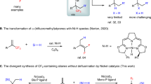 On the basis of above results55, 56, a plausible reaction mechanism involving a Ni(I/III) catalytic cycle is proposed (Fig. 3h). The comproportionation of in situ-generated Ni(0) from the reaction of Ni(II) with alkylzinc reagent and the remaining Ni(II) species generates the Ni(I) complex [(tpy)NiI-X] (A)53, which subsequently produces alkyl nickel complex [TpyNi-Alkyl] (B) through transmetalation with alkylzinc. Because such a terpyridine-based nickel(I) complex B is actually a nickel(II) complex [(tpy−1)NiII-alkyl]53, a one-electron, ligand-based redox pathway would be occurred in the reaction of B with gem-difluoropropargyl bromide 2 to generate C and difluoroalkyl radical53. Recombination of C with difluoroalkyl radical produces nickel(III) complex [Alkyl(Tpy)NiIII(Rf)X] (E, R f = CF2CCR2), which subsequently undergoes reductive elimination to deliver gem-difluoropropargylated alkane and regenerate A simultaneously.