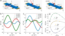 High-quality Bi2Se3 films ranging from 5 to 20 QLs are grown on Al2O3 (0001) substrates in a MBE system (MBC-1000-2C from ULVAC) with a base pressure <1.5 × 10–9 Torr, by using two-step deposition procedure44,45. The sapphire substrates are first cleaned in acetone, isopropanol and de-ionized water, and subsequently annealed at 750 °C for 30 min in a vacuum after being transferred into the growth chamber. Elemental Bi (6N) and Se (5N) solid sources are evaporated from standard Knudsen cells under a Se/Bi flux ratio of ~20. To reduce Se vacancies in Bi2Se3, initial 2–3 QL Bi2Se3 are deposited at 150 °C, and then the substrate temperature is ramped to 250 °C at 5 °C min−1 under Se flux for the second step growth. Our Bi2Se3 films have smooth surface with a roughness of ~0.5 nm and show a clear terrace step of ~1 nm (≈1 QL). The morphology indicates the high quality of our Bi2Se3 films. After the Bi2Se3 growth, the bare Bi2Se3 films are immediately transferred into a magnetron sputtering chamber via air in the standard cleanroom environment with a well-controlled levels of low humidity and constant temperature. The transfer time was strictly controlled under 5 min before pumping down the sputtering chamber. For the ST-FMR devices, a 7-nm thick Co40Fe40B20 (CFB) is subsequently sputtered on the Bi2Se3 film with a low power of 60 W at room temperature with a base pressure of ~3 × 10−9 Torr. Finally, the Bi2Se3/CFB bilayer is protected by the sputtered MgO (2 nm)/Al2O3 (3 nm) layer. For the MOKE imaging devices, the Py (6 nm)/MgO (1 nm)/SiO2 (4 nm) stacks are subsequently sputtered onto the Bi2Se3 (8 QL) films with an in-situ magnetic field along the y-axis (i.e., perpendicular to the current channel, see Fig. 5f) at room temperature with a base pressure of ~3 × 10−9 Torr. A very low sputtering power of 40 W is used for the Py deposition. Subsequently, five 2-μm wide grooves on the Py layer are etched and backfilled with nonmagnetic metal Cu, which divide the continuous Py layer into five rectangles and make them magnetically isolated. All devices are patterned by photolithography and ion milling.