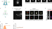 We first examined a population of growing wild-type non-competent cells. Bacterial cells in culture are asynchronous, with different stages of the cell cycle represented in proportion to their relative duration. S. pneumoniae is a rugby ball-shaped bacterium that divides perpendicularly to the long axis of the cell. Its characteristic oval shape is achieved through a combination of peripheral and septal cell wall syntheses, both limited at the site of cell division. Newborn cells (classified as category A in Fig. 1a) arise with most components of the cell division machinery already in place28. These cells undergo a short period of cell elongation associated to peripheral cell wall synthesis (Fig. 1a, categories B and C), before cell division29. Cells of category C are also called “pre-divisional cells.” A distinctive feature of the cell division process in the pneumococcus is that cell constriction is concomitant with septal cell wall synthesis and cell elongation28,29. These combined activities, all occurring at the division site, ensure the formation of the new almost hemispherical halves of the two future daughter cells. Once the division process (cytokinesis) is complete, the two newborn cells remain linked by a peptidoglycan bridge resulting in a cell pair. Figure 1b, top row, shows a representative field of non-competent cells (strain R3956, Supplementary Table 1). Physical parameters were automatically measured for a total of 6993 cells collected over six independent experiments, and the cells were subsequently classified according to their morphological type (Fig. 1a). The proportion of cells in the population displaying each cell type is diagrammed in Fig. 1c. Cells without a constriction (group I) accounted for 76% of the population, while 24% of the cells were dividing (group II) (Fig. 1c, d). This is in agreement with previous results observed for asynchronous cultures of S. pneumoniae 29,30. In contrast, the proportion of dividing cells gradually increased over time in competent cultures reaching a maximum of 38%, 30–40 min after CSP induction (Fig. 1c, d). As these cultures eventually recovered a cell-type distribution similar to that measured in non-competent populations over the next 60–90 min (Supplementary Fig. 3), these results suggest that the constriction process undergoes a deceleration or transient block upon CSP induction. Furthermore, closer examination of cell shape parameters in cultures developing competence reveals a progressive accumulation of pre-divisional cells, corresponding to the C cell-type category (Fig. 1a, c and Supplementary Fig. 3). Similar analysis of dividing cells from group II shows an increase of the number of cells near completion of cell constriction (category F cell type, Fig. 1c). Conversely, newborn cells (category A cell type, Fig. 1a) decrease in the population (Fig. 1c and Supplementary Fig. 3). Finally, plotting the cell dimensions revealed that, while the cell width remains fairly constant in all cell categories regardless of their competent or non-competent state, the cell length increases throughout the cell cycle and this increase is even higher during division of competent cells (Supplementary Fig. 2). Together, this analysis demonstrates that alteration of cell cycle progression in competent cells results from a transient inhibition of two key steps in the division process: initiation and completion of cell constriction. We reached an analogous conclusion when we compared the cell-type distribution of non-competent and competent cultures of the encapsulated strain G5431 (Supplementary Fig. 2), suggesting that a delay in the cell division process is a general feature of competent pneumococci.
