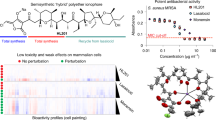 For untargeted metabolomic comparisons of wild-type and ∆pks C. acetobutylicum, single colonies of each strain were heat shocked at 80 °C for 10 min and used to inoculate 10 mL of liquid CGM (30 g/L glucose). Following overnight incubation (stagnant) until reaching OD600 ~1.0, these cultures were used to inoculate 10 mL of liquid CGM (80 g/L glucose) with a 10% inoculum for subculturing. After ~5 h (OD600 ~1.0) of stagnant growth, the subcultures were used to inoculate quadruplicate flask fermentations (70 mL CGM, 80 g/L glucose + 5 µL Antifoam 204, 3% inoculum) agitated via magnetic stir bars. Calcium carbonate (6 g/L) was supplemented to the fermentation media for pH buffering. All culturing was performed at 37 °C. About 5 µg/mL Th was included in all cultures of ∆pks with the exception of the final fermentation culture, as certain antibiotics are known to perturb the ABE fermentation phases. Samples of fermentation broth (1 mL) from each replicate were taken during early stationary phase and extracted with 3 mL of 2:1 chloroform methanol. The mixtures were vortexed, separated via centrifugation (2700×g, 10 min), and the bottom chloroform-rich layer was transferred to a glass vial. These organic extracts were dried with nitrogen gas, resuspended in 100 µL methanol, and 10 µL was injected onto an Agilent Technologies 6520 Accurate-Mass QTOF LC-MS instrument fitted with an Agilent Eclipse Plus C18 column (4.6 × 100 mm). A linear gradient of 2–98% CH3CN (vol/vol) over 40 min in H2O with 0.1% formic acid (vol/vol) at a flow rate of 0.5 mL/min was used. The metabolomic analysis platform XCMS16 (The Scripps Research Institute) was used to compare the metabolomes of wild-type and ∆pks strains based on the quadruplicate LC-HRMS data. MS peaks unique to ∆pks (Fig. 1a) were identified using the following parameters: p-value < 0.01, fold change > 10.0, peak intensity > 5000.