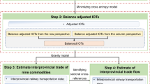 where \(y_i^{rs}\) is the trade flows of sector i from region r to region s, \(e^{\beta _0}\) is the constant proportionality, \(x_i^{rO}\) is the total outflows of sector i from region r, \(x_i^{Os}\) is the total inflows of sector i to region s, d rs is the distance between region r and region s (we use the distance between the capital cities of the two provinces in the study), β 1 and β 2 are weights assigned to the masses of origin and destination, respectively, and β 3 is the distance decay parameter. Equation (1) can be transformed into
