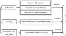 The decline of China’s export emissions from 2007 to 2012 was mainly due to production structure changes and energy efficiency gains. Growth in export volume (i.e. the product of export per capita and population) was the strongest factor which drove China’s increase in export emissions. The growth of export per capita would have increased export emissions by 8.5% from 2007 to 2010 and 10.6% from 2010 to 2012 with other factors held constant (Fig. 4). From 2007 to 2010, energy efficiency gains was the strongest factor to offset China’s export emissions. It would have decreased export emissions by 11.2% from 2007 to 2010 (Fig. 4). From 2010 to 2012, production structure changes surpassed energy efficiency gains becoming the strongest factor to offset China’s export emissions. Production structure changes and energy efficiency gains would have decreased export emissions by 5.5 and 4.8% from 2010 to 2012, respectively. Above results show that production structure changes were an important factor to offset China’s export emissions during 2007–2012. In the new normal, China has been making efforts to change its economic development mode and targeting high-quality economic growth, i.e., growth driven by higher value added and lower resource intensive inputs. The country is taking numerous measures to save energy, reduce carbon emissions and control local air pollution. Therefore, production structure changes are expected to continue to decrease (export) emissions in the future.