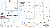 We use a model similar to our three-dimensional image-based biological age predictor18. After confirming that PLSC1 and PLSC2 in the cell population data linearly predict time, we ordered single cells based on the PLS model of cell population. First, we built a PLS model from the cell population data by using only the 1593 genes that overlap between cell population DEGs and single-cell expressed genes (RPKM > 0.5 in at least eight samples the RNA-seq data and have non-zero value for more than half single cells). We first extract the first and second PLS components most correlated with the actual sample collection time using the “pls” package in R, where Wn in formula \({\mathrm{PLSC}}n = X \cdot Wn\) is solved for the variables matrix X, the cell population expression value matrix for the above-described 1593 genes, and build a linear model by \(T = q1*{\mathrm{PLSC1}} + q2*{\mathrm{PLSC2}} + e\), by regressing PLSC1 and PLSC2 against the sampling time in cell population. The above functions were packaged into the “iCpSc.CpToScTime” utility.