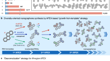 Despite generation of diaza-HBP 6a through solution synthesis, further characterization of 6a was restricted by its low stability. In addition, attempts to oxidize intermediate product 8a–c directly to diaza-HBC derivatives resulted in insoluble solids, which could not be characterized. This led us to adapt the solution chemistry of PAMYs to on-surface synthesis34,35,36,37, which offers today a new approach to organic chemistry. We thus deposited 5c on Ag(111) by molecular beam evaporation (Methods section and Supplementary Fig. 2). Upon annealing to 270 °C, small quantities of diaza-HBC 7c were detected as displayed in Fig. 5a. Unlike solution synthesis (Fig. 2), no intermediate product 8c was identified after annealing the deposited 5c in several ultra-high vacuum (UHV) preparations on Ag(111), Ag(100), Cu(111), and boron nitride (BN) on Cu(111), suggesting that homocoupling and dehydrogenation occur synergistically at the employed reaction temperatures. Notably, 7c was detected on BN/Cu(111) templates38 at similar annealing temperatures in trace-quantities (Supplementary Fig. 3), indicating that the on-surface coupling strategy proceeds in a metal-free fashion, further motivating studies on reaction mechanisms and on-surface synthesis on insulators.