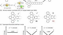DFT Calculations in Fig. 4 were performed using the Gaussian 09 software package. The geometries were optimized at the B3LYP/6-311 G(d,p) level. The excitation energies were calculated by the TDDFT method at the B3LYP/6-311 G(d,p) level. NICS were calculated using the gauge invariant atomic orbital (GIAO) approach at the GIAO-B3LYP/6-311 + G(2d,p) level. NICS(1) values were averaged by two positions (above and below the plane). For Figs. 5 and 6, periodic DFT calculations were performed with the VASP code48, projector augmented wave potentials49 and plane waves expanded to a kinetic energy cutoff of 400 eV. Exchange-correlation effects were treated by the van der Waals density functional50 in the version denoted as rev-vdWDF251. The Ag(111) surface was represented by four layered slab separated by approx. 15 Å of vacuum region. Furthermore, a p(10×10) super cell was used together with a 2×2 k-point sampling. All structures were geometrically optimized until the residual forces on all atoms were smaller than 0.01 eV/Å, except for the bottom two layers of the slab, which were frozen in the bulk distance. An exhaustive conformational search identified the preferred adsorption site (Site b, Supplementary Fig. 4). The site’s adsorption height was further optimized for a gas-phase molecule and found to be 3.22 Å between the molecular and metallic planes (Site c, Supplementary Fig. 4). This site was employed to simulate the STM and AFM images. STM images were simulated with the Tersoff-Hamann approximation52 using the implementation by Lorente and Persson53. AFM simulations were performed with a modification of the particle probe model code42 by Hapala et al. The DFT-derived Hartree potential was employed to prepare an electrostatic grid which together with the molecular Lennard-Jones potential acted as the force-field for simulating the frequency shift of a probe C = O particle as detailed in ref. 46. The simulations involved oscillating a probe particle with an amplitude of 5 Å at a height of 7.7 Å above the substrate. The terminal oxygen was given a negative charge of - 0.005e. The probe’s stiffness x,y,z components were set to 3 N m−1, 3 N m−1 and 50 N m−1, respectively.