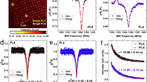 A CW-ESR spectrum at X-band is shown in Fig. 4a with resonance peaks from PL1 to PL4 VV defect types, as well as a cluster of signals near the g-factor g = 2, known to be from VSi, VC and/or N13, 18. In order to properly resolve some of these peaks, we subtract the ESR spectrum measured with 976 nm illumination from the spectrum obtained with either 940 or 365 nm illumination. The differential spectra, shown in Fig. 4b, then correspond to possible charge transfer with VV which is extremely sensitive to these wavelengths (further considerations are discussed in Methods section). The ESR peak intensities are given for the main identified defects in Fig. 4c (left). With 940 nm, two sets of resonances can be clearly assigned, the strongest due to \({\rm{V}}_{{\rm{Si}}}^ -\) (T V2a or V2 center) and the weakest from N− (k site). At this wavelength, VV− undergoes photoionization to become VV0, emitting an electron to the conduction band which is likely captured by \({\rm{V}}_{{\rm{Si}}}^0\), and resulting in an increase in \({\rm{V}}_{{\rm{Si}}}^ -\). With 365 nm, large changes can be seen around g = 2, possibly from free electrons and VC, though the peaks are too clustered to be resolved. On the side of g = 2, N− appears much stronger while the \({\rm{V}}_{{\rm{Si}}}^ -\) peaks completely disappeared. While this may be due to carrier-induced spin relaxation, such behavior is also well explained by charge dynamics: N, initially in its neutral-charge state due to either photoionization or thermal emission (shallow donor) before cooling down the sample, captures most of the generated electrons to give a high N− signal. The holes now in majority, are captured by the various deep defects, with VV− being converted toward VV0 (high signal), \({\rm{V}}_{{\rm{Si}}}^ -\) toward \({\rm{V}}_{{\rm{Si}}}^0\) (low signal), and possibly \({\rm{V}}_{\rm{C}}^{\rm{0}}\) toward \({\rm{V}}_{\rm{C}}^ +\) (high signal).