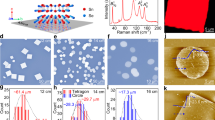 Figure 1a shows an optical image of a mechanically exfoliated Fe0.021Sn0.979S2 flake on a Si/SiO2 substrate. Atomic force microscopy (AFM) and magnetic force microscopy (MFM) were used to characterize the height and magnetism of the samples, respectively. MFM is a valuable tool that can potentially be used to detect magnetic interactions between a magnetized AFM tip and samples36. Recently, MFM has been employed to characterize the magnetic response of single- or few-layer 2D nanosheets, such as graphene and MoS2 37, 38. However, it has been reported that MFM signals have nonmagnetic contributions due to capacitive and electrostatic interactions between the nanosheets and the conductive cantilever tip38, 39. In this study, AFM and MFM images of Fe0.021Sn0.979S2 and pure SnS2 were obtained under the same test condition. The AFM images show that the obtained Fe0.021Sn0.979S2 and pure SnS2 are monolayers (Fig. 1b, Supplementary Fig. 1a). The MFM images show that the Fe0.021Sn0.979S2 monolayer has a larger negative phase shift (523 mo) than that of the pure SnS2 monolayer (51 mo) (Supplementary Fig. 1b, c) by approximately ten times, which should largely contribute to the difference in the magnetic and electrical properties between the Fe0.021Sn0.979S2 and SnS2 monolayers. Raman spectroscopy has been widely used in 2D TMD alloys, and it changes with the composition of the alloy18, 40. The Raman peaks of the Fe0.021Sn0.979S2 and pure SnS2 monolayers are located at 314 cm−1, corresponding to the A 1g mode of SnS2 3, 10. The A 1g mode of the Fe0.021Sn0.979S2 monolayer is broader than that of the pure SnS2 monolayer (Fig. 1c). This broadening behavior, which is due to the doped atoms, has also been observed in other 2D alloys20.