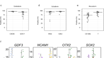 We analyzed our hiNPSC and hiPSC lines, at different passages, by 3′ digital gene expression RNA-sequencing (DGE-seq), a quantitative method based on molecular indexing of messenger RNA (mRNA) molecules27,28. Controls used in this analysis are primed (H1 and H9) and naive (HNES1) hESC lines19. Principal component analysis (PCA) revealed two major components: the first discriminating between parental cells and pluripotent stem cells, the second discriminating between H1 and H9 on one side and HNES1 on the other side (Fig. 1c). T2iLGö and RSeT hiNPSC lines were separated along the second principal component. The majority of T2iLGö hiNPSCs clustered with HNES1, regardless of passage number, while cells exposed to RSeT formed two intermediate clusters and tended to become more similar to primed human PSCs (hPSCs) at later passages (trajectory drawn in Fig. 1c). To assess the development stage associated with hiNPSCs in different culture media, we compared them by PCA to the single-cell RNA-seq data sets of hESCs upon derivation (P1 and P10), high-passage hESCs, human epiblast cells and human morula cells11,12 (Fig. 1d). The first component classified samples from the morula cells, the cellular fate preceding pluripotency, to high-passage primed hESCs. Strikingly, T2iLGö hiNPSCs cluster together with epiblast cells while RSeT hiNPSCs sit between primed and naive PSCs. Altogether, these data reveal that our protocol can reprogram somatic cells directly to a state resembling the human epiblast, without an intermediate passage in primed media.