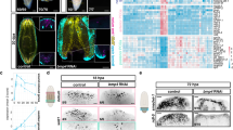 Terminal deoxynucleotidyl transferase dUTP nick end labeling (TUNEL) staining was performed as previously described5: animals were treated with 10% n-acetyl cysteine in PBS for 5 min, fixed in 4% formaldehyde/PBST-0.3% for 20 min and permeabilized 1% SDS/PBS for 20 min. Samples were bleached overnight in 6% H2O2/PBST-0.3% and rinsed in PBS. The next steps were performed using the TUNEL Apoptosis Detection Kit (Millipore). Samples were incubated with terminal transferase enzyme in reaction buffer for 4 h at 37 °C, then rinsed in stop/wash buffer, followed by 0.25% BSA/PBST-0.3%, and incubated with anti-digoxigenin-rhodamine in blocking solution for 4 h. Finally, animals were rinsed four times in 4 0.25% BSA/PBST-0.3% for 10 min each, incubated in Hoechst/PBST-0.3% for 2 h and mounted using Aqua-Poly/Mount (Polysciences, Inc.). All steps were performed at RT, unless indicated otherwise.