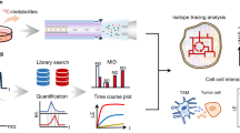The MAM workflow (Fig. 1) first generates a metabolomic array in microtiter plate format via reversed-phase liquid chromatographic separation of a crude biological extract produced by a “stimulus” organism. A portion of the effluent is diverted to a polarity-switching electrospray mass spectrometric analyzer (ESI-MS) and the remainder of the effluent to a microtiter plate fraction collector after passing through a UV/Vis diode array detector. Following evaporation and resuspension of collected fractions, cell preparations from a “response” organism (e.g., humans, represented by tissue cells) are added to the microtiter wells for incubation with the metabolomic fractions to induce cellular responses (Fig. 1a). Cells within wells are then stained for viability, fixed, and permeabilized, and fluorescent cell barcoding (FCB, Fig. 1b) is used to label the well contents via differential staining of cells with N-hydroxysuccinimide (NHS) ester-functionalized fluorescent dyes3. Thus, “barcoded” cells in the microtiter wells are then pooled and stained with multiple fluorescent antibodies to quantitate cell status and targeted cell-type-specific responses to metabolites. Critically, flow cytometric gating based on the barcoding fluorophores facilitates the assignment of cells to their original coordinates on the microtiter plate metabolite array (i.e., “deconvolutes” treatment conditions for each cell), yielding simultaneous bioassay marker quantitation per well for each targeted antibody–fluorophore conjugate. Barcoding enables high-throughput antibody assays by using a fraction of antibody reagents compared to a microtiter format, and pooling also ensures the uniformity of antibody staining of cells across all wells, decreasing experimental variation. The result is a multiplexed series of well coordinate-linked immunoassay profiles running through the metabolomic fraction array. Metabolomic features (positive and negative m/z, UV, and retention time), which are generated via EIC analysis of all significant detected metabolites, are then manually or automatically correlated with bioactivity features, which are peaks generated from bioassay profiles across wells.