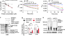 For OxICAT analysis, YPH499 strain was grown in three biological replicates at 28 °C on minimal synthetic medium (0.67% (w/v) yeast nitrogen base, 0.079% (w/v) CSM amino acid mix) containing 2% (v/v) galactose to OD600 about 0.6 and treated or not with 1 mM H2O2 (H1009, Sigma) for 30 min. Temperature-sensitive Mia mutants were grown on minimal synthetic medium (0.67% (w/v) yeast nitrogen base, 0.079% (w/v) CSM amino acid mix) containing 3% (v/v) glycerol supplemented with 0.05–0.2% (v/v) glucose. Mia mutants were grown at 19 °C or shifted to restrictive temperature of 37 °C. For OxICAT analysis, mia40-4int and corresponding wild-type (YPH499) yeast cells were grown in four biological replicates and shifted for 3 h to restrictive temperature (37 °C). At an OD600 of 0.8–1, cells were collected. For translation experiments, strains were grown on minimal synthetic medium (0.67% (w/v) yeast nitrogen base, 0.079% (w/v) CSM amino acid mix) containing 2% (v/v) glucose at 30 °C or YPG medium (1% (w/v) yeast extract, 2% (w/v) peptone, 3% (v/v) glycerol) at 28 °C. Cells were treated with various concentrations of H2O2 (H1009, Sigma), NAC (A9165, Sigma), ebselen (ALX-270-097, Enzo Life Sciences) and/or MG132 (BML-PI102, Enzo Life Sciences) when indicated. To treat cells with MG132, yeast were grown in modified YNB medium without ammonium sulphate but with 0.003% SDS. The samples were supplemented with either 25 µM MG132 or a corresponding volume of dimethyl sulphoxide (DMSO) as a solvent. For isolation of mitochondria, yeast strains were grown on YPG medium (1% (w/v) yeast extract, 2% (w/v) peptone, 3% (v/v) glycerol) or YPGal medium (1% (w/v) yeast extract, 2% (w/v) peptone, 2% (v/v) galactose). Mitochondria were isolated by differential centrifugation according to the previously described method54. Isolated mitochondria were resuspended in SM buffer (250 mM sucrose, 10 mM 3-(N-morpholino)propanesulfonic acid-KOH, pH 7.2). For Blue Native gel electrophoresis, mitochondria were resuspended in digitonin-containing buffer (1% [w/v] digitonin, 20 mM Tris-HCl, pH 7.4, 50 mM NaCl, 10% (w/v) glycerol, 0.1 mM EDTA, 1 mM phenylmethylsulphonyl fluoride (PMSF)) and the soluble fraction was separated on a 4–13% gradient gel at 4 °C. For OxICAT analysis, isolated mitochondria were resuspended in 10% TCA.