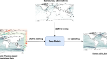 where \(P_{\mathrm{baro}}\) is the barometric pressure at sea surface and Psw is the water pressure at the temperature and salinity of the water within the mixed layer. XCO2 is the weekly mean CO2 concentration for dry air extracted from the GLOBALVIEW-CO2 database56. Psw was calculated assuming 100% humidity using sea surface temperature and salinity and Pbaro is the monthly mean barometric pressure at the sea surface from the NCEP/NCAR Reanalysis database57. All the data used were taken from the SOCAT files.