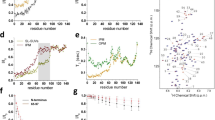 CEST-NMR is widely used to probe the interaction of amyoloidogenic proteins58,59. Here we employed CEST measurements11,60,61,62,63 to directly probe the equilibrium between vesicle unbound and bound states of alpha-synuclein. CEST has enhanced characteristics compared to standard heteronuclear correlation spectroscopy in probing the details of the equilibrium between NMR visible (unbound alpha-synuclein) and NMR invisible (vesicle bound alpha-synuclein). These include a significant sensitivity at low vesicle:protein ratios and the avoidance of other factors that may influence the transverse relaxation rates of the protein resonances. CEST experiments were carried out at 10 °C on a Bruker spectrometer operating at 1H frequencies of 800 MHz equipped with triple resonance HCN cryo-probe. The measurements were based on 1H-15N HSQC experiments by applying constant wave saturation of 400 Hz in the 15N channel. A series of large offsets was employed (−9, −7, −5, −4, −3, −1.5, 0, 1.5, 3, 4, 5, 7, 9 kHz), and additional spectrum, saturated at −100 kHz, was recorded as a reference. The saturation of the bound state is transferred to the free state via the conformational exchange of these two states, resulting in the saturation of the peak intensities in the visible unbound state. The CEST experiments were recorded using a data matrix consisting of 2048 (t2, 1H) × 220 (t1, 15N) complex points.
