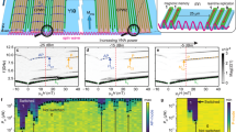 The program OOMMF (http://math.nist.gov/oommf) was utilized. The simulated structure consists of a YIG waveguide (30 μm × 5 μm × 20 μm) (x y z) and 9 cobalt stripes (length (y) 5 µm, thickness (z) 30 nm) placed on top in the center of the YIG. If not mentioned otherwise, we used an MS = 139.26 kAm−1, an exchange coefficient A = 3 × 10−12 J m−1, a damping constant α = 2.3 × 10−4 for YIG and MS = 1350 kAm−1, A = 13 × 10−12 J m−1, and α = 0.01 for the cobalt stripes. The mesh was set to 5 nm × 500 nm × 10 nm. To excite the magnetization, an excitation area was set around the stripes. Within this area, we had a uniform field in x direction changing with time t and H0 = 10 mT according to \(H_{{\mathrm{ex}}} = H_0\,\sin \left( {2{\mathrm{\pi }} \times 100\,{\mathrm{GHz}}\left( {{{t}} - 100.1\,{\mathrm{ps}}} \right)} \right)/\left( {2{\mathrm{\pi }} \times 100\,{\mathrm{GHz}}\left( {{{t}} - 100.1\,{\mathrm{ps}}} \right)} \right)\). An additional global bias field was applied in the y direction. The ground state of the magnetization was determined by minimizing the energy of the structure. Starting from there the time-dependent magnetization has been simulated for 1000 equidistant times in steps of 5 ps. In the evaluation, the acquired magnetic configurations have been used to perform a two-dimensional fast fourier transformation (FFT) in time and x direction. For the results shown, this method has been performed on the cells on one side of YIG, not covered by stripes. Therefore, the dispersion relations represent excited spin waves propagating from the center (excitation area with stripes) into the unpatterned YIG film.