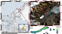 Land surface temperatures (LST) and lake ice phenology for 2000–2012 were determined from 8-day Global LST and Emissivity (MOD11A2) and daily Snow Cover (MOD10A1) data from the Moderate Resolution Imaging Spectroradiometer (MODIS) (lpdaac.usgs.gov), respectively. Mean summer (JJA) LST was computed for glaciated surfaces within the watershed (1–2 June to 28–29 August) following Mortimer et al.22. MOD11A2 with an LST uncertainty of >2 °C were removed, while remaining pixels with a temperature of >0 °C were assigned a temperature of 0 °C39. For each year, mean JJA LSTs were computed for pixels having at least 7 of 12 possible 8-day observations and a linear regression was performed on each pixel having mean JJA LST observations in all 12 years. Ice phenology on Lake Hazen was tracked from 5 May to 5 September, after which cloud cover frequently interfered with MODIS data acquisition. Major phenology events in the lake ice record (onset and end of break-up and freeze-up) were identified at the inflection points in MOD10A1 data. Days having >15% cloud cover were excluded from the analysis and data were interpolated for such periods. Mean daily ice-free area (% of total lake area) on Lake Hazen was calculated each year for the period between 5 May and 5 September. Monthly (MJJA) lake surface temperatures for the period 2000–2012 were quantified for thirty 9 km2 areas on Lake Hazen’s surface (approximately 50% of the offshore lake surface area, avoiding contamination from terrestrial landscapes) using MOD11A2 and MYD11A2 subsets (http://daac.ornl.gov/MODIS/).