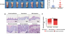 1.5% AOM/DSS protocol: 8-week-old NCD or HFD-fed mice were i.p. injected with 10 mg/kg body weight AOM (A5486, Sigma-Aldrich) at day 1 of the 1.5% AOM/DSS protocol (Fig. 1c). At day 5 mice were exposed to 1.5% DSS (MW = 36,000–50,000, 0216011080, MP Biomedicals) in the drinking water for 5 days (DSS water was refreshed at day 7) and provided with normal drinking water from day 10 on until the end of the experiment at day 62. Animals were killed with 8 weeks at day 0 for non-colitic control tissue or at day 13 for colitic analysis or at day 62 for tumour analysis. The colon length was measured from caecum till the anus. The distal part of the colon was used for non-colitic and colitic analysis. At day 62 tumours were counted in a blinded fashion by number, size (<2 mm, >2 mm) and percentage of the afflicted area of the distal colon. Tumour and non-tumour tissue from the distal colon was separated and used for tumour analysis.