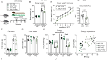 For GTT, mice were fasted overnight and then given an intraperitoneal injection of glucose (2 g kg−1 BW)15. For ITT, non-fasted mice were injected intraperitoneally 4 h after the beginning of the light cycle with 0.4 U kg−1 BW of human insulin (Humalin® R, Eli Lilly & Co., Japan). Blood samples for glucose and insulin measurements were obtained from the tail vein at indicated times. For AKT-S473 phosphorylation, all tissues were harvested 10 min after inferior vena cava injection of insulin (0.03 unit per head) under anesthesia with 2,2,2-tribromoethanol (36 mg per kg BW).