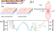 A ~50 nm-thick sacrificial layer of PEDOT:PSS (Clevios P VP AI 4083, Heraeus) was spin-coated onto an oxygen plasma-treated glass substrate (25 mm × 25 mm) at 4000 rpm for 60 s and baked for 10 min at 100 °C. Subsequently, a thin (<10 nm) adhesion promoter (mr-APS1, Micro Resist Technology) and the photo-curable nanoimprint lithography resist (mr-UVCur21-200nm, Micro Resist Technology) were spin-coated and baked according to the manufacturer’s guidelines (in brief, mr-APS1 was spin-coated at 4000 rpm for 60 s and baked for 60 s at 150 °C and UVCur21-200nm was spin-coated at 3000 rpm for 60 s and baked for 20 s at 100 °C). A transparent perfluoropolyether soft stamp—comprising a negative of the final grating structure (mixed- and second-order with nominal grating periods of 340 nm, 350 nm and 360 nm, in second-order)—was molded into the UV curable polymer layer using a UV imprint alignment system (EVG620, EV Group; λ = 365 nm; dose 56 mW cm−2; exposure time 220 s). After removing the soft stamp, the grating surface (average thickness, 50 nm) was treated with an oxygen plasma to remove any remaining organic residues and reduce hydrophobicity. Three different gain materials were tested in this study: poly(9,9-dioctylfluorene-co-benzothiadiazole) with a 9:1 ratio of F8 to BT units (F80.9BT0.1; Mw = 52,000 g mol−1; ADS233YE, American Dye Source Inc.), poly(9,9-dioctylfluorene-co-benzothiadiazole) with a 1:1 ratio of F8 to BT units (F8BT; Mw = 61,000 g mol−1; ADS133YE, American Dye Source Inc.) and a poly(para-phenylene-vinylene) copolymer (Super Yellow; Mw = 1.7×106 g mol−1; PDY-132, Merck). These were dissolved in toluene at 25 mg ml−1 (F80.9BT0.1 and F8BT) and 10 mg ml−1 (Super Yellow), respectively, and the resulting solutions spin-coated at 2000 rpm for 60 s, yielding a gain layer of (180 ± 10) nm (for F80.9BT0.1 and F8BT; see Supplementary Fig. 6 for concentration-dependent layer thickness) and (250 ± 10) nm (Super Yellow). To release the membrane from the rigid glass substrate, the sample was immersed in deionized water heated to 55 °C for 1 h.