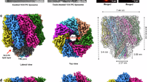 The image processing workflow was performed with RELION 2.156. Image stacks were motion corrected with the program MotionCor2, after which the contrast transfer function values were estimated and corrected using Kai Zhang’s Gctf. 1009 particles were manually picked to create templates for autopicking. 178,149 particles were automatically selected and sorted through four runs of 2D classification. 113,613 particles were chosen for a run of unsupervised 3D classification, using our negative-stain reconstruction as initial reference. Only the class composed of 10 radial spokes was considered (24,822 particles) and further refined imposing C10 symmetry. After movie refinement and particle polishing, the particles were once again refined. Since the reconstructed map had the wrong handedness, apparent by the unusual left-handed coil–coil density, the refined map was flipped and finally post processed. The final reconstruction used for model building had a resolution of 6.1 Å according to the FSC = 0.143 criterion. Local resolution varied from ~5 Å in the head domains to 6–7 Å in the coiled-coil and foot domains. For validation, the final 3D map was projected in 2D for comparison with the experimental 2D class averages using EMAN257, imposing C10 symmetry and using 5° rotational steps. FSC between the model and the final map was computed using an online tool based on EMAN2 (https://www.ebi.ac.uk/pdbe/emdb/validation/fsc/), which revealed an agreement between map and model up to a resolution of 6.6 Å (FSC = 0.5).