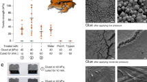 We utilize interface-sensitive SFG in conjunction with ATR-IR to provide direct evidence of glycoproteins at the contact interface, as previously hypothesized in literature7, 14, 24,25,26,27. Glycosylation occurs in glues produced by many organisms5, 6 and is therefore a common strategy in nature to design adhesive proteins. However, the glycoproteins by themselves (as in washed aggregate glue) do not stick well as the removal of LMMCs results in an irreversible change in glycoproteins, thus highlighting the critical role played by LMMCs in forming a good initial contact20. Previous studies show that LMMCs keep the glycoproteins soft and mobile by sequestering atmospheric water and directly solvating the glycoproteins20. Our results show that LMMCs play a key role not only in facilitating initial contact but also in maintaining adhesion, especially at high humidity. At 90% RH, liquid-like water is absent from the contact interface (Fig. 4a and Supplementary Fig. 3), although the aggregate glue contains 50% liquid-like water in the bulk (Fig. 5a)33. If liquid-water were strongly bonded with the substrate at high humidity, it would result in de-bonding of the aggregate glue from the substrate, which is not observed experimentally49. In addition, the insensitivity of the sapphire interaction peak (~3550 cm−1) to increase in humidity shows that the bonds between the aggregate glue and sapphire surface remain intact as humidity increases. We observe reversible changes in the secondary structures of glycoproteins present at the interface at high humidity for pristine aggregate glue suggesting water–protein interactions. In contrast to pristine aggregate glue, liquid-like water is observed at the polyacrylic acid/sapphire interface at high humidity. Our SFG observations of pristine aggregate glue together with results obtained for model polyacrylic acid polymer suggest the sequestration of interfacial liquid-like water by the hygroscopic LMMCs, thus explaining the cohesive failure of Larinioides cornutus aggregate glue at high humidity. Tan et al. reports similar observations with synthetic adhesives, where the osmotic pressure effect of sodium chloride in water improves the adhesion underwater50. Thus, hygroscopic LMMCs and glycoproteins team-up in sequestering interfacial water at high humidity, thereby overcoming a fundamental limitation of conventional synthetic adhesives.