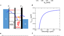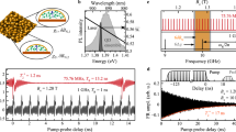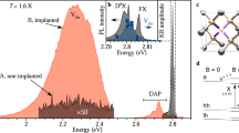 Experimental observation of discretization. Figure 1a shows the normalized photoluminescence (PL) spectrum of the ZnSe:F sample, measured under continuous-wave excitation with a photon energy of 3.05 eV. Besides the free excitons (FE) of the heavy hole (HH) and light hole (LH), the corresponding neutral donor-bound excitons D0X can also be seen. In the applied transverse magnetic field, the ground (D0) and excited (D0X) states are split by the Zeeman energy. The D0 electron spin 1/2 splits into two states. The splitting of the D0X state is defined solely by the hole spin. Due to confinement and strain in the structure, only the low energy HH states with spin ±3/2 are considered18, 19. The schematic in Fig. 1a presents the corresponding optical selection rules in the z-basis20. For further details on the sample structure and a complete description of the PL spectrum, we refer to ref.21. Figure 1b shows normalized time-resolved Kerr rotation (TRKR) signals for low (0.3 mW) and high (10 mW) pump power, measured in the Voigt geometry for B x = 34 mT, oriented normal to the optical axis taken as z-axis. The spin ensemble is oriented by the pump pulses arriving at time zero along this z-axis and then precesses in the zy-plane around the applied magnetic field along the x-axis. Figure 1b shows an exemplary fit to the high power data (the dashed gray line) in the delay time range 1–9 ns using the form: \(A_{{\mathrm{KR}}}\) = \(A_0\,{\mathrm{cos}}(\omega t + \varphi ){\mathrm{exp}}\left( { - t{\mathrm{/}}T_2^ \ast } \right)\), with the initial electron spin polarization A0, the pump-probe delay t, the oscillation phase φ and the spin dephasing time \(T_2^ \ast\). In this case \(T_2^ \ast = (10.0 \pm 0.2)\) ns. The dephasing times at low magnetic fields, as used in this work, are limited by the nuclear spin fluctuations in the donor surroundings, see ref.21. The main feature in Fig. 1b is the significant difference in the electron spin precession frequencies of ω (P = 10 mW) − ω (P = 0.3 mW) = 3.499 − 3.362 = 0.137 ns−1 for the two used powers. In Fig. 1c we show the photon energy dependencies of the normalized Kerr rotation amplitude throughout the excited donor states for both pump powers. The implications of the relative energy shift between the two dependencies are discussed later in the paper.