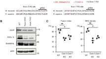 Cardiotoxin experiments were carried out according to previous literature46. Fifty microliters of 10 μM cardiotoxin (Sigma or Latoxan) was injected into tibialis anterior muscle of 8- to 12-week-old mice. The muscle was harvested at 2 weeks post-injection, and snap-frozen in isopentane cooled with liquid nitrogen. Longitudinal cryosections (thickness, 7 µm) obtained from the muscle were stained with anti-MyHC and anti-laminin antibodies and visualized with a microscope (Axio-observer Z1). In silico analysis on regenerating muscle was conducted by using NCBI dataset (#GDS4924)45.