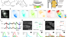 Rapid cortical inhibition has previously been implicated in the expression of FM direction selectivity32. However, our model suggested that excitatory ON/OFF RF arrangement alone could contribute to FM direction selectivity. We tested this prediction by targeting one class of inhibitory interneurons, parvalbumin-positive interneurons (PV+), using a pharmacogenetic silencing approach. PV+ neurons are fast spiking and preferentially target perisomatic regions of excitatory pyramidal cells, providing strong feedforward synaptic inhibition33. In auditory cortex, PV+ neurons are well-tuned for frequency and exhibit short response-latencies34, leading to the possibility that evoked PV+ inhibition can ‘out run’ and/or overwhelm synaptic excitation evoked by FM sweeps in non-preferred directions32,35 to enforce direction selectivity. We tested this proposal in A1 by selectively expressing the inhibitory DREADD receptor, hM4i, in PV+ cells. AAV-DIO-hM4i-mCherry virus was unilaterally injected into the auditory cortex of Pvalb-Cre mice to target the hM4i receptor to A1 PV + cells (Fig. 6a). After allowing sufficient time for transduction and expression (eight weeks, see Methods), we performed electrophysiological recordings to measure evoked responses in A1 to pure tones and FM sweeps. Evoked activity was compared between an initial recording period (Baseline), and after intraperitoneal injection of the DREADD agonist, clozapine-N-oxide (CNO; 5 mg/kg; see Methods), when the excitability of PV+ neurons was reduced. Following CNO injection, the magnitude of evoked local field potentials (LFPs) increased in hM4i-PV+ but not sham control animals (Fig. 6b–d—normalised ON response at BF post-CNO: 2.24 ± 0.14 in hM4i-PV+ animals vs. 1.10 ± 0.02 in sham control animals; Wilcoxon signed rank test: p = 2.2 × 10−6; n = 56 and n = 24, respectively), consistent with reduced cortical inhibition in hm4i-PV+ animals only. However, the overall tuning profile of LFP FRAs were unchanged (Fig. 6e; non-significant change in ON CF between Baseline and post-CNO: 0.04 ± 0.03 oct; Wilcoxon signed rank test: p = 0.26). Multiunit (MU) recordings revealed that CNO injection produced a robust and significant increase in spontaneous and evoked firing rates in hM4i-PV+ but not control animals (Fig. 6f, g; normalised spontaneous firing rate post-CNO: 3.14 ± 0.27 in hM4i-PV animals vs. 1.13 ± 0.08 in sham control animals, p = 2.0 × 10−7; normalised evoked ON firing rate post-CNO: 2.48 ± 0.26 in hM4i-PV animals vs. 1.17 ± 0.09 in sham control animals, p = 2.5 × 10−4; normalised evoked OFF firing rate post-CNO: 2.81 ± 0.29 in hM4i-PV animals vs. 1.13 ± 0.11 in sham control animals, p = 5.3 × 10−7; Wilcoxon signed rank tests; N = 7 and N = 3, respectively). The overall structure of MU FRAs were also unchanged (Fig. 6h, non-significant change in evoked ON CF: 0.09 ± 0.05 oct, p = 0.41), indicating that PV+ inhibition plays a prominent role in regulating excitability but not sensory tuning of local A1 neurons34,36. We further found no significant differences in ON/OFF RF bandwidth and best frequency threshold level for single units recorded pre- and post- CNO injection (p > 0.1 for all variables tested, Wilcoxon rank sum test; n = 30 and 29 units pre- and post-injection). Having confirmed the fidelity of the pharmacogenetic perturbation in hM4i-PV+ animals, we assessed directional sensitivity in single units following CNO injection and compared to ON/OFF RF arrangement in neurons that possessed V-shaped ON and OFF RFs (n = 29 cells in N = 7 mice; see Methods). Within this population, neurons exhibited direction selectivity, and the alignment of ON/OFF RFs in individual neurons remained a predictor of direction selectivity (Fig. 6i, Supplementary Figure 6c). Overall, the magnitude of direction selectivity (assessed via direction selectivity index; DSI) was correlated with the relative distribution of ON/OFF preferred frequencies (r = −0.40 at 2.2 oct/sec; p = 0.03; Fig. 6j). We therefore conclude that the segregated arrangement of ON/OFF RFs in A1 neurons can confer directional sensitivity to FM sounds, as predicted by our theoretical model.