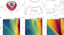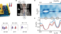 We employed scanning tunneling spectroscopy (STS)23,24 to identify Kondo screening of the vacancy magnetic moment by the distinctive zero-bias resonance it produces in the dI/dV curves (I is the tunneling current and V the junction bias), hereafter called Kondo peak. We first discuss samples consisting of two stacked single layer graphene sheets on a SiO2 substrate (G/G/SiO2) capping a doped Si gate electrode (Fig. 1b). A large twist angle between the two layers ensures electronic decoupling, and preserves the electronic structure of single layer graphene while reducing substrate induced random potential fluctuations24,25,26. A further check of the Landau-level spectra in a magnetic field revealed the characteristic sequence expected for massless Dirac fermions2,23, confirming the electronic decoupling of the two layers (Supplementary Note 1).Vacancies were created by low energy (100 eV) He+ ion sputtering followed by in situ annealing22,27,28. In STM topography of a typical irradiated sample (Fig. 1c) the vacancies appear as small protrusions on top of large background corrugations. To establish the nature of a vacancy we zoom in to obtain atomic resolution topography and spectroscopy. Single atom vacancies are recognized by their distinctive triangular \(\sqrt 3 \times \sqrt 3 \;R30^\circ\) topographic fingerprint (Fig. 1c inset)27,28,29 which is accompanied by a pronounced peak in the dI/dV spectra at the DP reflecting the presence of the ZM. If both these features are present we identify the vacancy as a single atom vacancy (Supplementary Note 2) and proceed to study it further. In order to separate the physics at the DP and the Kondo screening which produces a peak near Fermi energy, EF ≡ 0, the spectrum of the vacancy in Fig. 1d is taken at finite doping corresponding to a chemical potential, μ ≡ EF−ED = −54 meV. Far from the vacancy (lower curve), we observe the V shaped spectrum characteristic of pristine graphene, with the minimum identifying the DP energy. In contrast, at the center of the vacancy (Fig. 1d upper curve), the spectrum features two peaks, one at the DP identifying the ZM and the other at zero bias coincides with the position of the expected Kondo peak3. (In STS the zero-bias is identified with EF.) From the line shape of the zero-bias peak (Fig. 1f inset), we extract TK = (67 ± 2)K by fitting to the Fano line shape30,31 characteristic of Kondo resonances (Supplementary Note 3). As a further independent check we compare in Fig. 1f the temperature dependence of the linewidth to that expected for a Kondo-screened impurity30,32 (Supplementary Note 4), \(\Gamma _{\mathrm{{LW}}} = \sqrt {\left( {\alpha k_{\mathrm{B}}}T \right)^2 + \left( {2k_{\mathrm{B}}T_{\mathrm{K}}} \right)^2}\) from which we obtain TK = (68 ± 2) K, consistent with the above value, and α = 6.0 ± 0.3 in agreement with measurements and numerical simulations on ad-atoms30,33. Importantly, as we show below, this resonance is pinned to EF over the entire range of chemical potential values studied, as expected for the Kondo peak34,35.