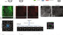 Width (w) and height (h): We measured the “width” and “height” from each four-cells motif in basal and apical surfaces. The “width”/“height” is defined as the distance between two vertices in the quadrilateral that defines a four-cells configuration along the longitudinal/transverse axis (Fig. 4a, c). The average “width” \(\left\langle w \right\rangle\) and the average “height” \(\left\langle h \right\rangle\) of a motif were calculated as the average of each measurement: w1and w2, and h1 and h2 (Fig. 4a, c), which were estimated using FIJI straight-line tool.