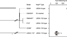 The soybean cultivars used in the study were G. max (L.) Merr. cv. Hardee (Rj2), CNS (Rj2), IAC-2 (Rj2), and Lee (rj2). The mung bean cultivar was V. radiata cv. KPS1. For nodule counting and acetylene-reducing activity (ARA) assays, seeds of G. max and V. radiata were surface sterilized in 0.5% sodium hypochlorite for 1 min and then washed 10 times with sterile distilled water. The seeds were sown in a 300 ml plant box (CUL-JAR300; Iwaki, Tokyo, Japan) containing sterile vermiculite and watered with a nitrogen-free plant nutrient solution51. Bradyrhizobium strains were cultured for 5 or 6 days. The number of cells was adjusted to 107 ml−1 in sterile water by direct counting with a Thoma hemocytometer (Kayagaki Irika Kogyo Co. Ltd., Tokyo, Japan), and 1 ml aliquots were inoculated onto surface-sterilized seeds. Plants were grown in a plant growth cabinet (NK Systems Co. Ltd., Osaka, Japan) at 25 °C with a photoperiod of 16 h light/8 h dark. The number of nodules and the dry weights of nodule and plant were determined 28 DAI. The ARA of roots was analyzed as described by Itakura et al.52 Briefly, the roots were transferred into a 100 ml vials (SVG-100, Nichidenrika-glass, Co. Ltd., Kobe, Japan) and acetylene gas was injected at a final concentration of 10% (vol/vol). The vial was incubated for 30 min at 25 °C. The ethylene concentration was determined with a Shimadzu GC-18A gas chromatograph (Shimadzu Co., Kyoto, Japan) equipped with a flame ionization detector and a Porapack N column (GL Sciences, Inc., Tokyo, Japan).