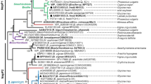 Bacterial strains are listed in Supplementary Data 1. Bradyrhizobium strains were grown aerobically at 30 °C in HEPES-MES (HM) salt medium47 (supplemented with 0.1% arabinose and 0.025% [wt/vol] yeast extract). Escherichia coli strains were grown at 37 °C in Luria–Bertani medium48. Agrobacterium rhizogenes was grown at 28 °C in Yeast Extract Peptone medium49. The following antibiotics were added: for Bradyrhizobium strains, kanamycin (Km) at 100 mg l−1, spectinomycin (Sp) at 100 mg l−1, and streptomycin (Sm) at 100 mg l−1, or polymyxin B (Px) at 50 mg l−1; for E. coli, ampicillin (Ap) at 50 mg l−1, Sp at 25 mg l−1, and Sm at 25 mg l−1, or Km at 50 mg l−1; for A. rhizogenes, chloramphenicol at 30 mg l−1 or Km at 100 mg l−1.