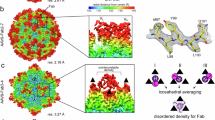 The AAV2L336C substitution was created within the AAV2 cap gene encoding all three viral proteins, VP1, VP2, and VP3, as previously described5. A recombinant baculovirus, encoding the AAV2 cap gene, with the L336C substitution, was created using the Bac-to-Bac system (Thermo Fisher). A plaque purified and titered baculovirus stock was used to infect Sf9 insect cells, at a multiplicity of infectivity of 5 to generate virus-like particles (VLPs). The harvested pellet (from lysed cells and polyethylene glycol precipitated supernatant) was freeze/thawed three times with Benzonase (EMD Millipore Cat#712053) treatment. After the third thaw, the resulting clarified supernatant was purified using a step iodixanol gradient followed by anion exchange46 and then dialyzed into 50 mM HEPES, pH 7.4 with 2 mM MgCl2 and 150 mM NaCl. The sample concentration was determined by optical density assuming an extinction coefficient of 1.7 mg mL−1 cm−1) for AAV2 VLPs. The VLP purity and integrity were confirmed by sodium dodecyl sulfate polyacrylamide gel electrophoresis and negative stain EM on an FEI Spirit TEM, respectively.