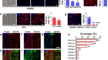 The Vybrant MTT colorimetric assay (Life Technologies, Thermo Fisher) was used to determine viable cell migration. Tubular scaffolds seeded with either 8.5 × 105 hMAB or 1 × 106 hMAB with/without mFB (ratio 85:15, n ≥ 3) were cultured in static conditions for 6 days and then incubated with MTT diluted 1:10 in proliferative medium for 4 h at 37 °C. Scaffolds were washed with PBS, opened longitudinally and placed at the bottom of a multiwell plate for imaging with a stereomicroscope. Formazan-positive cells were visible within the scaffolds. Images of flat open scaffolds were analysed for cell migration measuring the colour intensity along 8 random lines drawn radially from the centre of cell clusters to the edge of the scaffold using ImageJ software. The Gray Value graph obtained from the lines was used to measure the distance in mm covered by the cells, calculated between the centre of the cluster and the most distant cell. Analyses and calculations were performed by three independent operators in blind on 6 scaffolds per condition and in 2 experimental replicates. The average cell migration distance in seeded scaffolds was determined.