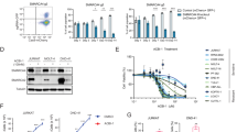 SHQ1 regulation of MYC gene splicing and expression is important for T-ALL cell survival. a MYC minigene splicing was analyzed in 293T cells expressing control (Ctrl) or SHQ1 shRNA (sh1 or sh2) (top), and also in 293T cells expressing SHQ1 or empty vector in the presence of DMSO or GSI (Compound E, 1 μM) (bottom). Semi-quantitative RT-PCR was performed to analyze unspliced and spliced RNA. Splicing efficiency was calculated and shown as the ratio of spliced verse total RNA. b Schematic of MYC gene with three exons and two introns. Specific primer sets were designed to amplify pre-mRNA (E1–I1 and E2–I2) and mature mRNA (E1–E2 and E2–E3) (left). Endogenous MYC pre-mRNA and mature mRNA in HPB-ALL were analyzed by qPCR (right). Blue, red, or purple bars represent indicated RNA quantifications in control shRNA, SHQ1 shRNA-1, or -2-expressing cells. c Representative immunohistological images of MYC in spleen sections from mice bearing sgSHQ1-JURKAT cells injected with or without doxycycline (Fig. 4d). Scale bar, 50 μm. Histological stain was quantified using ImageJ and plotted on the right. d Immunoblots of SHQ1 and MYC in GFP+ cells from 3 fetal liver HSPC transplant samples in Fig. 5d. e HPB-ALL cells were infected with lentiviruses expressing control (Ctrl, blue) or SHQ1 shRNA (sh2, purple). Glucose uptake and lactate secretion were examined 4 days post infection, normalized to the same number of live cells. f Analysis of MYC target genes implicated in glycolysis by qPCR and immunoblots in control or SHQ1-deficient HPB-ALL cells 4 days post infection. Blue or purple bars represent indicated RNA quantifications in control shRNA, SHQ1 shRNA-2-expressing cells. g SHQ1 inducible-knockout JURKAT cells were overexpressed with MYC or blank control. Cell death was analyzed and quantified with (purple) or without (blue) doxycycline (Dox, 1 μg ml−1). h Cell growth was assessed using murine T-ALL T6E and 8946 cells. T6E cells were infected with MSCV-shControl (Ctrl, black), MSCV-shmSHQ1 (shmSHQ1, blue), MSCV-shControl-MYC (MYC OE+Ctrl, red), or MSCV-shmSHQ1-MYC (MYC OE+shmSHQ1, purple) as denoted. Sorted GFP+ cells were used for cell growth analysis (left). In all, 8946 cells were infected with MSCV-shControl (Ctrl) or MSCV-shmSHQ1 (shmSHQ1). Sorted GFP+ cells were subjected to doxycycline treatment (1 μg ml−1) to suppress human MYC transgene expression (MYC off+Ctrl, red; MYC off+shmSHQ1, purple), with PBS treatment as a control (Ctrl, black; shmSHQ1, blue), followed by cell growth analysis (right). Data shown represent the means (±SEM) of three biological replicates; *p < 0.05, **p < 0.01, ***p < 0.001; n.s. non-significant, unpaired t-test (b, c, e, f, g, h)