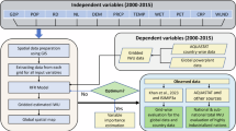 Thirty candidate variables from existing data sets were identified to represent potential enabling conditions as identified in Huber-Stearns et al.5 Variables either directly quantify conditions, as in the case of biophysical and economic characteristics, or serve as recognized proxies of city characteristics. Predictably, many of these variables are correlated, as they are based on shared information (i.e., several of the country level economic indices are calculated using GDP). Collinear and replicated variables were excluded. Selection was based on analysis of spearman pairwise correlations and variance inflation factors47. The R package Corrgram v1.1048 was used to calculate correlation coefficients. Of the 30 variables tested, 18 were found to be correlated with at least 1 other variable at corr > 0.7, indicating high collinearity17. Supplementary Table 4 provides the correlation coefficients between highly correlated variables (corr > 0.7) and justification for which of the correlated variables were selected for inclusion in the final models.