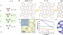 In Fig. 5 we provide a quantitative analysis of the numerical and experimental results along with our theoretical predictions, which are described later. In Fig. 5(a, b) we plot the relative frequencies \(n_{z_4,q}\) and \(n_{z_3,q}\) of vertices grouped by topological charge versus \(\eta = N_{z_3}/N_{z_4}\), the ratio between the two vertex coordinations. Figure 5(a) shows more precisely that in the z = 4 sector vertices obey the ice rule, with the only violations arising from negative topological monopoles of charge q = −2. These negative charges appear spontaneously and increase in relative number as the amount of decimation increases, which increases the strength of the violation of the ice rule on vertices of coordination z = 4. A measure of ice rule violation, the total density of negative charge \(q_{z_4} = \mathop {\sum}\nolimits_q n_{z_4,q}q\) appearing on the z = 4 vertices, is plotted in Fig. 5(c) as a function of the lattice decimation.