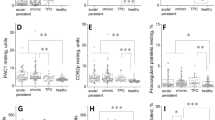 Platelet-rich plasma was collected from whole blood via centrifugation at 150 × g for 15 min. Platelets were enriched by centrifugation at 1000 × g for 10 min, washed twice with 1X dPBS and fixed in suspension with 4% PFA for 20 min. Samples were resuspended in 1× dPBS and seeded onto poly-l-lysine coated coverslips for 90 min at 37 °C. Platelets were stained as described in the Immunofluorescence microscopy of primary fibroblasts section above. Samples were imaged with the Leica TCS SP8 confocal using the 63×/1.4NA objective and a zoom factor of 2.5. For platelets size, particle analysis was performed on binary images after intensity thresholding. Overlapping events were excluded from the analysis.