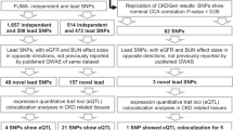 We took advantage of the catalogue of 107 independent SNPs implicated in GWAS of CKD-dt from Ko et al.13. We then identified further 10 SNPs associated with CKD-dt by searching GWAS catalogue and PubMed against the following criteria: (i) statistically significant (P <5 × 10−8) association with one of the following phenotypes; creatinine levels, eGFR, cystatin, blood urea nitrogen, urinary albumin–creatinine ratio, CKD, end-stage renal disease, nephropathy, proteinuria, (ii) r2 <0.2 with the SNPs in the catalogue by Ko et al.13. Thus, a total of 117 independent CKD-dt GWAS SNPs together with 2672 statistical proxies (r2 >0.8) were available for our further analysis (Supplementary Tables 15–16).