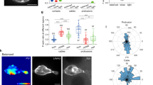 Movies were analyzed with custom-built Matlab routines. The segmentation of cell borders was performed on fluorescence images using the Matlab function Graythresh. Cell centroid positions were determined using the Matlab function Regionprops and used to quantify cell movement. To measure cell velocity, we computed instantaneous speed of cell centroids at each time frame, and then averaged it over several time frames. Cells stimulated through TIAM activation reached maximum speed soon after the beginning of illumination, so instantaneous speed was averaged between t = 15 min to t = 45 min. Cells stimulated through ITSN activation reached maximum speed at later stages, and instantaneous speed was thus averaged between t = 60 min to t = 90 min. Angular precision was computed as follows: for each cell, the displacement vector was computed between the initial cell centroid (averaged over the three first time frames) and the final cell centroid (averaged over the three last time frames), and we measured the angle between this vector and the axis of stimulation gradients. These angles were bootstrapped over 1000 replications, and angular precision was estimated with the formula \(p = \sqrt {\left( {( {{1}/{n}^\ast \mathop {\sum }\nolimits_{i = 1}^n \sin\theta _i} )^2 + \left( {{1}/{n}^\ast \mathop {\sum }\nolimits_{i = 1}^n \cos\theta _i} \right)^2} \right.} .\) The morphodynamics maps (Fig. 5c) were obtained using a routine adapted from Yang9. The cell contour was aligned such that the middle of the map was centered on the direction imposed by the optogenetic gradient.