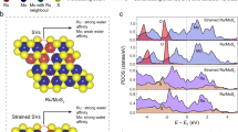 Obviously, the chemical adsorption and desorption of H atoms on the catalyst surface should be neither too strong nor too weak as they are competitive processes. According to the Sabatier31 principle, in the viewpoint of thermodynamics, a good HER catalyst should possess a hydrogen adsorption-free energy (ΔGH* as an activity descriptor) with an optimal value around zero32,33. Thus, we first calculated the hydrogen adsorption-free energy on Ru (0001) surfaces with or without Co substitution. The results showed that the ΔGH* values after Co atom substitution are more negative than that of pristine Ru (Fig. 5a), indicating stronger hydrogen binding abilities after Co atom substitution, which should lead to the obstacle of thermodynamic H* desorption process in the Heyrovsky step. Actually, relatively inert H2O molecules are the reacting species for HER in alkaline media, and hence the water dissociation kinetic of Volmer step, namely the energy barrier (ΔGw) of O–H bond cleavage, is usually more crucial to the overall reaction rate34. As shown in Fig. 5b, the favorable hydrogen desorption process is the Tafel step with ΔGw value of 13.42 kcal mol−1, being much lower than that of Heyrovsky step (ΔGw = 22.47 kcal mol−1). Moreover, it is also obviously lower than that of the Volmer step (ΔGw = 19.28 kcal mol−1), indicating that the water dissociation is indeed the rate-limiting process of HER in this material. Expectedly, the energy barrier of water dissociation has remarkably reduced after single Co atom substitution (denoted as RuCo1) compared with that of pristine Ru (ΔGw = 26.48 kcal mol−1), being consistent with the experimental observation. However, when increasing the substituted Co atoms to two (denoted as RuCo2) and three (denoted as RuCo3) per unit cell, the energy barriers instead increase to 23.01 and 21.89 kcal mol−1 (Fig. 5a, c), respectively, meaning that more Co substitution can lead to sluggish water dissociation due to the destruction of single atom dispersion. Moreover, the OH binding energy (ΔEOH) gradually increases with the addition of Co atoms (Fig. 5a), which should result from the increasing electron density in the saddle points (groove formed by the three nearest atoms) around Co atom (Fig. 5d). This change, on one hand, benefits for boosting the cleavage of O–H bond, but on the other hand, causes adverse OH to be desorbed and then blocks the consequent reactions. Therefore, a moderate ΔEOH value of the single atom doped structure can keep a favorable balance between facilitating water dissociation and preventing the active sites from inhibiting by the high-affinity hydroxides and finally accelerates reaction kinetics.