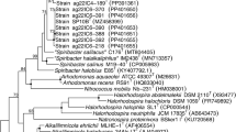 Total RNA from three independent S. cavolei cultures was isolated from cells in the mid-exponential growth phase using the RNeasy minikit (Qiagen, Hilden, Germany). Residual genomic DNA (gDNA) in the RNA samples was removed with DNase I (RNase free; Roche, Mannheim, Germany). RNA quality was checked by visual inspection after agarose gel electrophoresis using distinct rRNA bands as control. Synthesis of cDNA was done with 1 µg RNA as starting material in the RevertAid First Strand cDNA Synthesis kit (Thermo Scientific, Schwerte, Germany). The RT-PCE mixture contained 1 µg RNA, 2.5 µL reverse primer, 2 µL 10 mM dNTP mix and 3.5 µL 5× reaction buffer and PCR-grade water (Fermentas, St. Leon Rot, Germany) was added to a final volume of 17.5 µL. ReverseAid Reverse transcriptase (RT, 0.5 µL, 200 U mL−1) was added to 10.5 µL of the mixture (positive control), residual 7 µL of the reaction mixture without RT was used as negative control. Reaction mixtures were incubated for 1 h at 42 °C, the reaction was stopped for 5 min at 72 °C. PCR was performed with each 1 µL of positive and negative reactions, 2.5 µL forward and reverse primer, 1 µL 10 mM dNTP mix, 2.5 µL 10× reaction buffer, 14.5 µL PCR-grade water (Fermentas, St. Leon Rot, Germany) and 1 µL Taq polymerase (0.1 U µL−1, Thermo Scientific, Schwerte, Germany) in a thermocycler (Mastercycler, Personal, Eppendorf, Hamburg) with the following program: 95 °C for 5 min, 30 cycles of 95 °C for 1 min, 52 °C for 30 s, 72 °C for 1 min and final elongation at 72 °C for 10 min. S. halorespirans gDNA was isolated using the innuPREP Bacteria DNA kit (Analytik Jena AG, Jena, Germany) according to the manufacturer’s instructions. Quality of the extracted DNA was confirmed by gel electrophoresis. The PCR reaction mixture contained 1 µg DNA, 2.5 µL forward and reverse primer, 1.5 µL 10 mM dNTP mix, 5 µL HF reaction buffer and 0.5 µL Phusion DNA polymerase (2 U µL−1, Thermo Scientific, Schwerte, Germany). The mix was filled up to 25 µL with PCR-grade water (Fermentas, St. Leon Rot, Germany). The PCR program included following steps: 96 °C for 5 min, 30 cycles of 96 °C for 1 min, 60 °C for 30 s, 72 °C for 30 s and final elongation at 72 °C for 10 min in a thermo cycler (Mastercycler, Personal, Eppendorf, Hamburg). Used primer pairs are listed in Supplementary Table 4.
