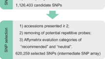 The high quality paired-end reads were mapped to the P. persica Genome v2.1.a1 (http://www.rosaceae.org/species/prunus_persica/genome_v2.0.a1) reference genome using BWA49 (v0.7.12) with the parameter: ‘mem -t 4 -k 32 –M’. PCR or optical duplicates were removed using SAMtools50. We performed SNP calling using a HaplotypeCaller approach as implemented in the package GATK51 (Genome Analysis Toolkit, v3.3-0-g37228af). To remove the potential false positive SNPs, SNPs with QD<2.0 or FS>60.0 or MQ<40.0 or MQRankSum<–12.5 or ReadPosRankSum<–8.0 were filtered. The accuracy of called SNPs was assessed using the customized Axiom® Peach 170 K SNP array with SNPs from 96 cultivated peach accessions (including the cultivated peach accessions in this study and from two previous studies;8,10 Supplementary Data 1). As the SNP array was developed based on the P. persica Whole Genome v1.0 reference genome, a liftover program (http://genomewiki.ucsc.edu/index.php/Same_species_lift_over_construction) was applied to transit the genotyped SNPs from the P. persica Whole Genome v1.0 reference genome to the P. persica Whole Genome v2.1.a1 for SNP validation.