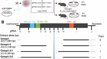 sgRNAs and Cas9 mRNA were prepared as described elsewhere46. Briefly, for each sgRNA the complementary pair of oligos (Extended Data Table 2) was annealed and cloned into pX330 (Addgene #42230). A T7-sgRNA PCR product was amplified with a T7 promoter sequence introduced on the forward primer in conjunction with a universal reverse primer sgRNA-uni.R (Supplementary Table 2) This product was used as the template for in vitro transcription (IVT) using the MEGAshortscript T7 IVT kit (Life Technologies). The Cas9 coding region was released from pX330 and sub-cloned into pBluescript II (pBS-Cas9). XhoI linearised pBS-Cas9 was used as the template for IVT using the mMESSAGE mMACHINE T7 ULTRA kit (Life Technologies). Both sgRNAs and Cas9 mRNA were purified using the MEGAclear kit (Life Technologies) and eluted in RNase-free water. 30 ng/μl of Cas9 mRNA and 15 ng/μl of each sgRNA diluted in RNase-free water were injected into one pronucleus of C57BL/6 × CBA F1 hybrid one-cell embryos. Injected embryos were cultured overnight to the two-cell stage, then surgically transferred into oviducts of day-of-plug pseudopregnant CD1 mice.